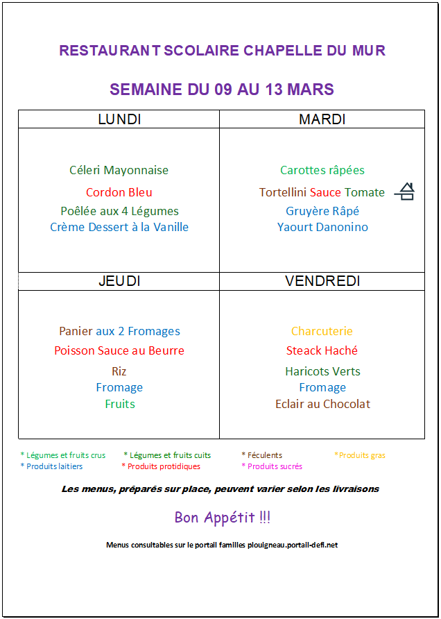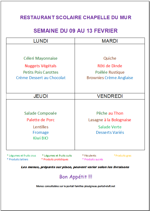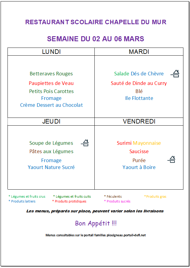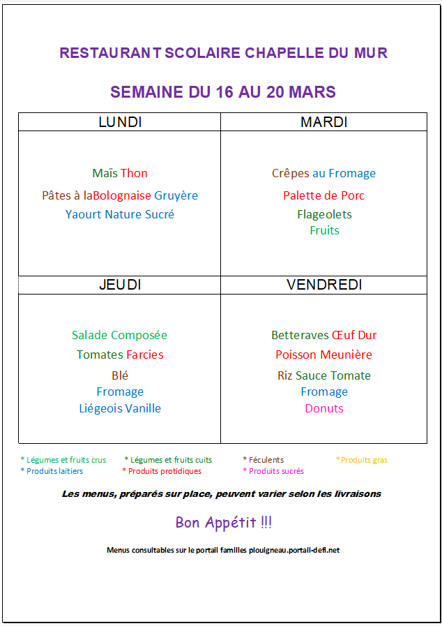 Menus cantine de la Chapelle Du Mur